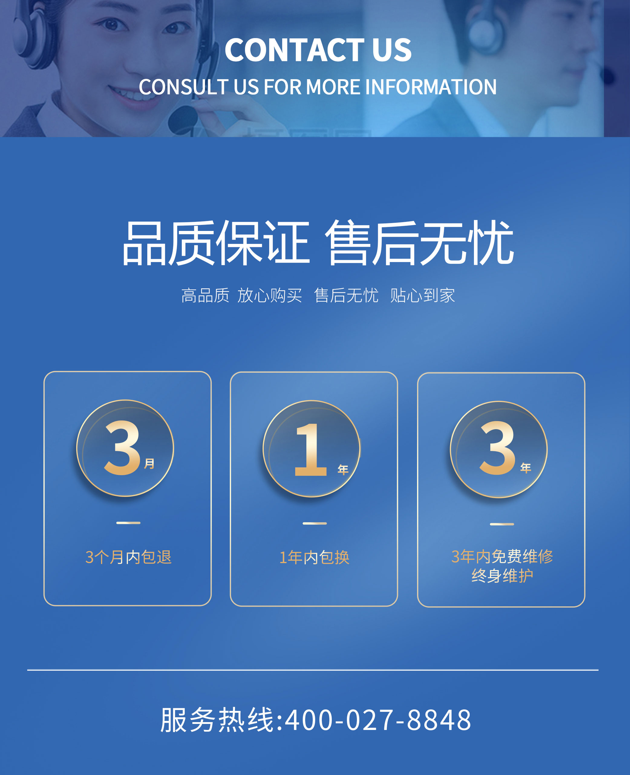 我們的售后服務承諾是:“3個月內(nèi)包退,1年內(nèi)包換、3年免費維修,終身維護”。在未來的日子里,我們將一如既往的堅持三類星級服務!