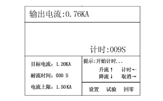 按上,輸出電流將不斷上升,松開就停止升流,如果到上限就提示滿量程;按下↓,輸出電流將不斷下降,松開就停止降流,如果到下限就提示已回零;按計時一,計時開始工作,到耐流時間計時結束完成試驗;