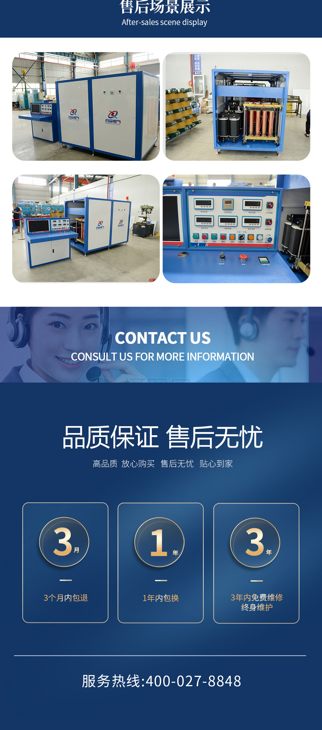 我們的售后服務承諾是:“3個月內包退,1年內包換、3年免費維修,終身維護”。在未來的日子里,我們將一如既往的堅持三類星級服務!